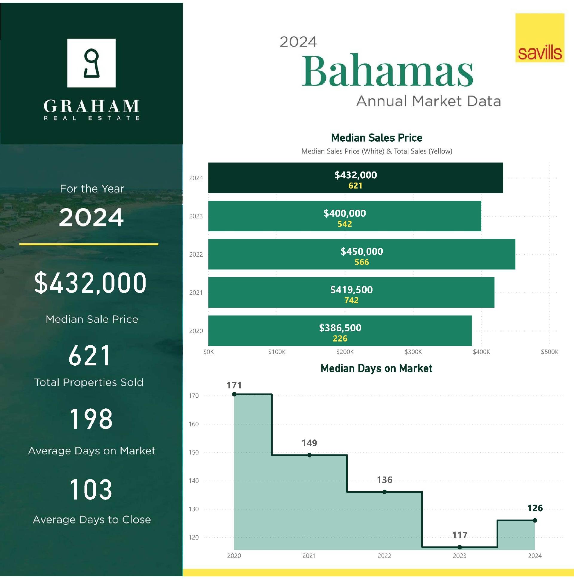 The Bahamas real estate market exhibited steady growth and resilience in 2024, with median sales prices increasing from $400,000 in 2023 to $432,000 in 2024, highlighting continued confidence in property values. Total property sales rose to 621 in 2024 from 542 in 2023, reflecting increased market activity and buyer interest. While the average days on market moved up slightly from 190 to 198, this indicates a steady pace of transactions, allowing buyers more time for informed decisions. Additionally, the average days to close improved significantly, dropping from 145 in 2023 to 103 in 2024, showcasing greater efficiency in the closing process. These trends underscore the market's strength and its appeal to both investors and homeowners.