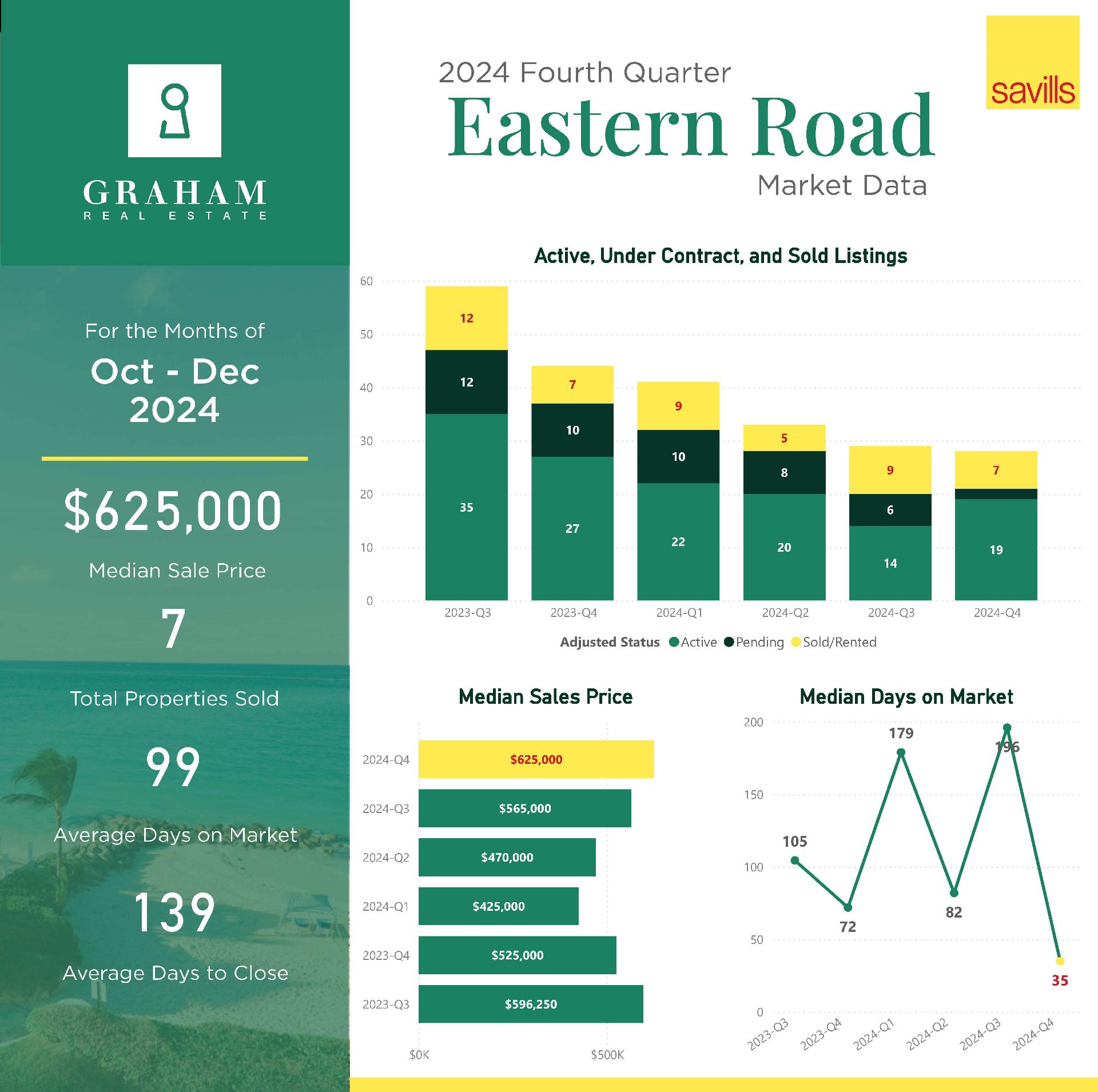 Eastern Road saw a modest increase in sales, with 7 homes sold compared to 6 in Q3. Property values adjusted to $212,500, and active listings increased from 14 to 19, offering buyers more variety. The average days on market saw a dramatic improvement, dropping from 260 to 99 days, indicating faster sales. Days to closing extended to 139 days, reflecting the area's high value and unique appeal.