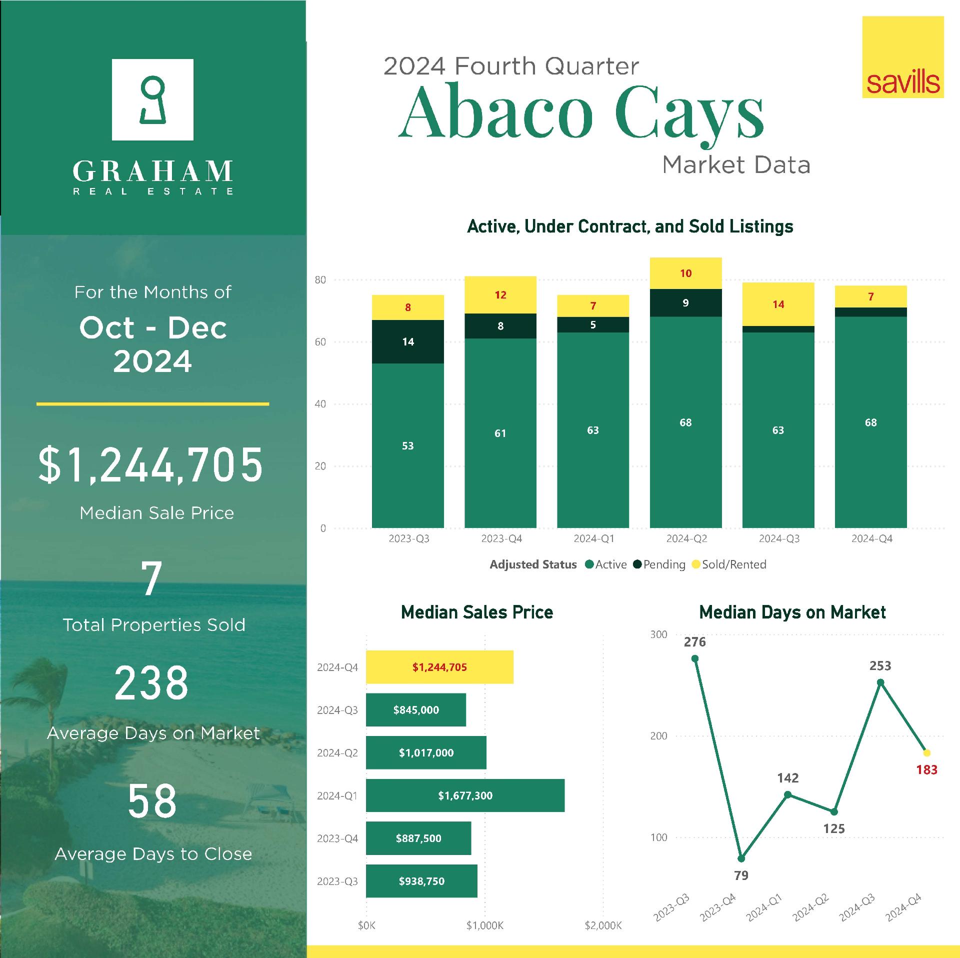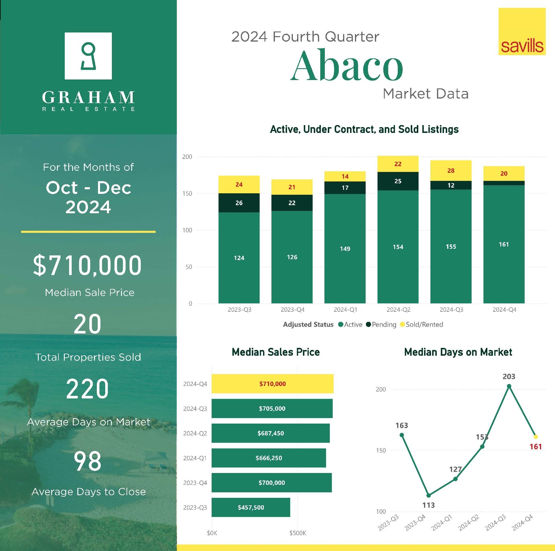 The Abaco market remained stable, maintaining 20 homes sold in both Q4 and Q3. However, property values climbed to $710,000, a 3.6% increase from $685,000 in Q3, showcasing the region's growing appeal and value retention. Active listings increased from 153 to 161, providing buyers with additional inventory to explore. The market became slightly more efficient, with the average days on market improving from 222 to 220 and days to closing seeing a significant reduction, dropping from 136 to 98 days. These improvements reflect strong buyer interest and smoother transaction processes.