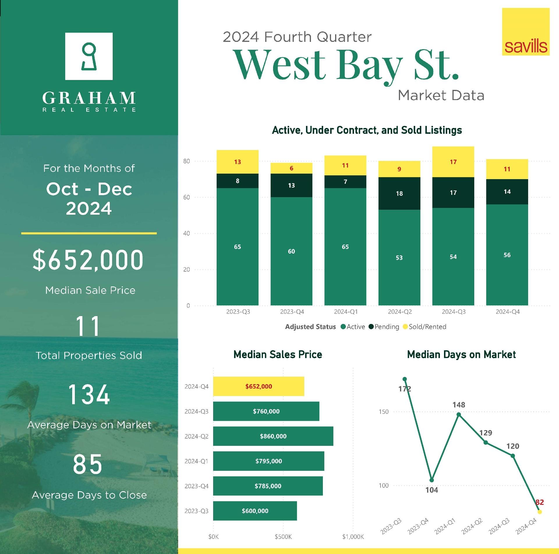 The West Bay Street market grew steadily, with sales increasing from 8 in Q3 to 11 in Q4. Property values adjusted to $652,000, reflecting accessibility for a wider buyer audience. Active listings rose slightly from 54 to 56, and the average days on market improved significantly from 251 to 134 days, indicating higher market efficiency. Days to closing remained swift at 85 days, supporting a reliable transaction environment.