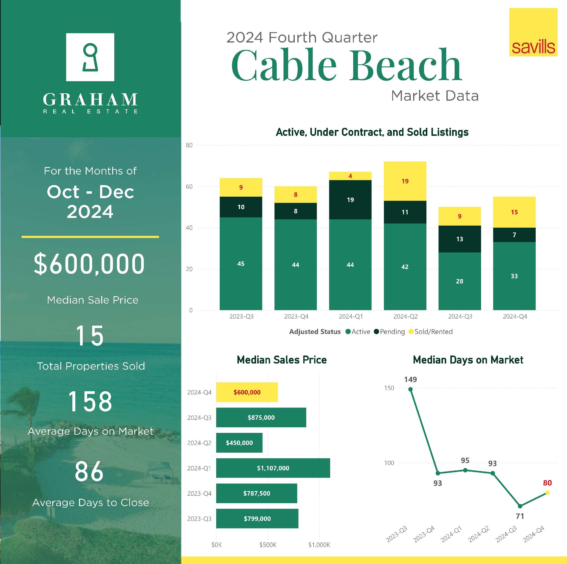 The Bahamas real estate market in Q4 2024 demonstrated vibrant activity and notable improvements across most regions. Increased home sales, rising property values in key areas, and more efficient transaction timelines reflect a dynamic and optimistic market outlook. While property values adjusted in certain segments, growing buyer interest, expanded listings, and quicker sales highlight the overall strength and resilience of the market.