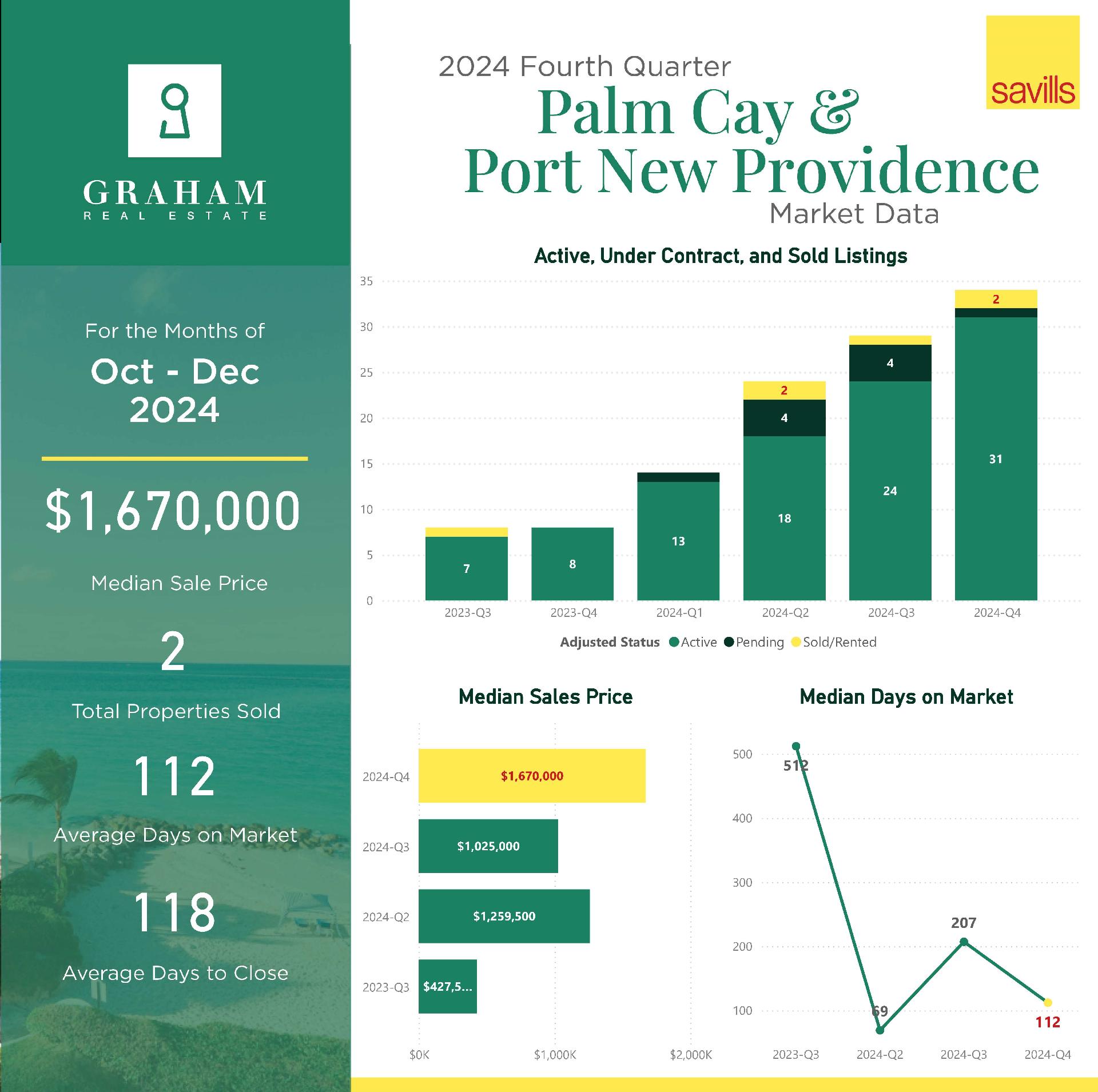 The Palm Cay and Port New Providence market demonstrated resilience and opportunity in Q4 2024. Home sales remained consistent at 2 for both Q3 and Q4, while active listings grew from 24 to 31, giving buyers a greater variety of options to explore. Property values adjusted from $1,962,500 in Q3 to $1,670,000 in Q4, offering more accessible pricing for prospective buyers. The average days on market improved significantly, dropping from 153 to 112, reflecting increased buyer interest and quicker transactions. Although days to closing extended from 90 to 118, this points to thorough processes ensuring smooth and secure completions. Overall, the market continues to provide attractive opportunities for both buyers and sellers.