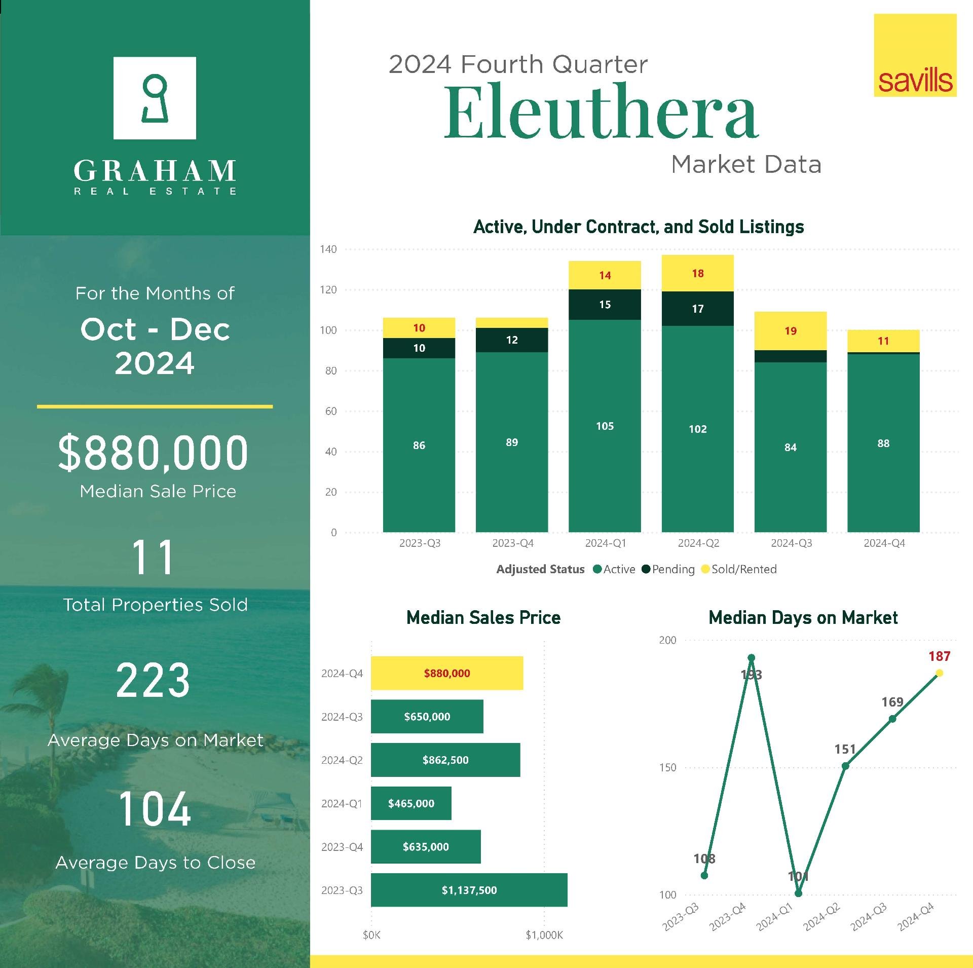 The Eleuthera market remained steady with 11 homes sold in both Q4 and Q3, demonstrating consistent demand. Property values rose significantly to $880,000, an increase of 13.5% from $775,000, highlighting Eleuthera's growing appeal. Active listings increased from 83 to 88, providing buyers with a broader selection. While the average days on market lengthened slightly from 208 to 223, this reflects continued interest in a competitive market. Days to closing, however, increased to 104 days from 73, potentially reflecting a shift toward more complex or higher-value transactions.