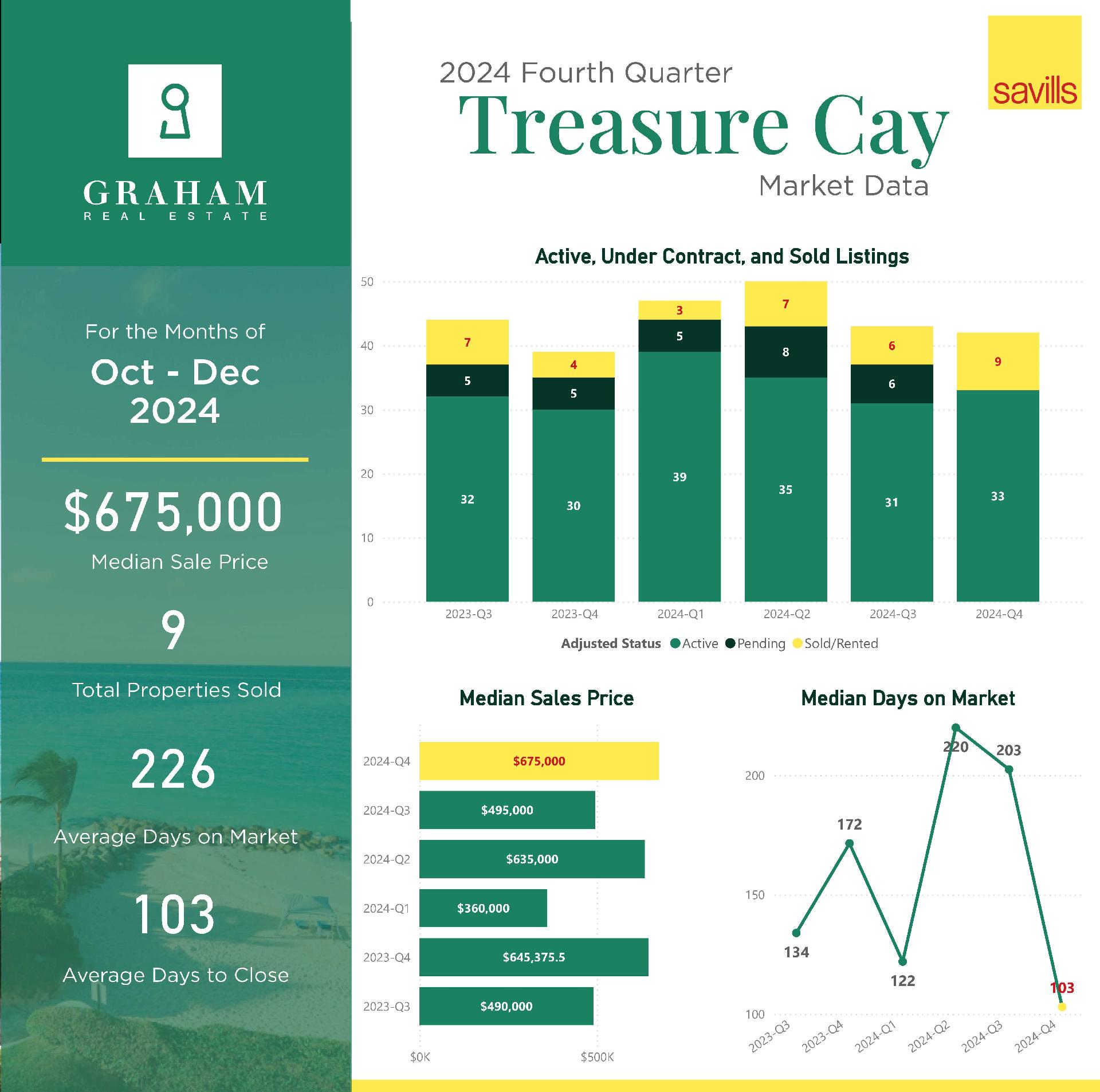 Treasure Cay experienced remarkable growth in Q4, with home sales more than doubling from 4 in Q3 to 9 in Q4. Property values rose to $675,000, a 5% increase from $642,500, reflecting growing demand. Active listings increased from 30 to 33, offering more options to buyers. Although the average days on market extended to 226, up from 177, this likely indicates a rise in buyer consideration periods for higher-value properties. Days to closing saw a dramatic improvement, dropping from 202 to 103 days, signaling faster transactions and heightened efficiency in the closing process.